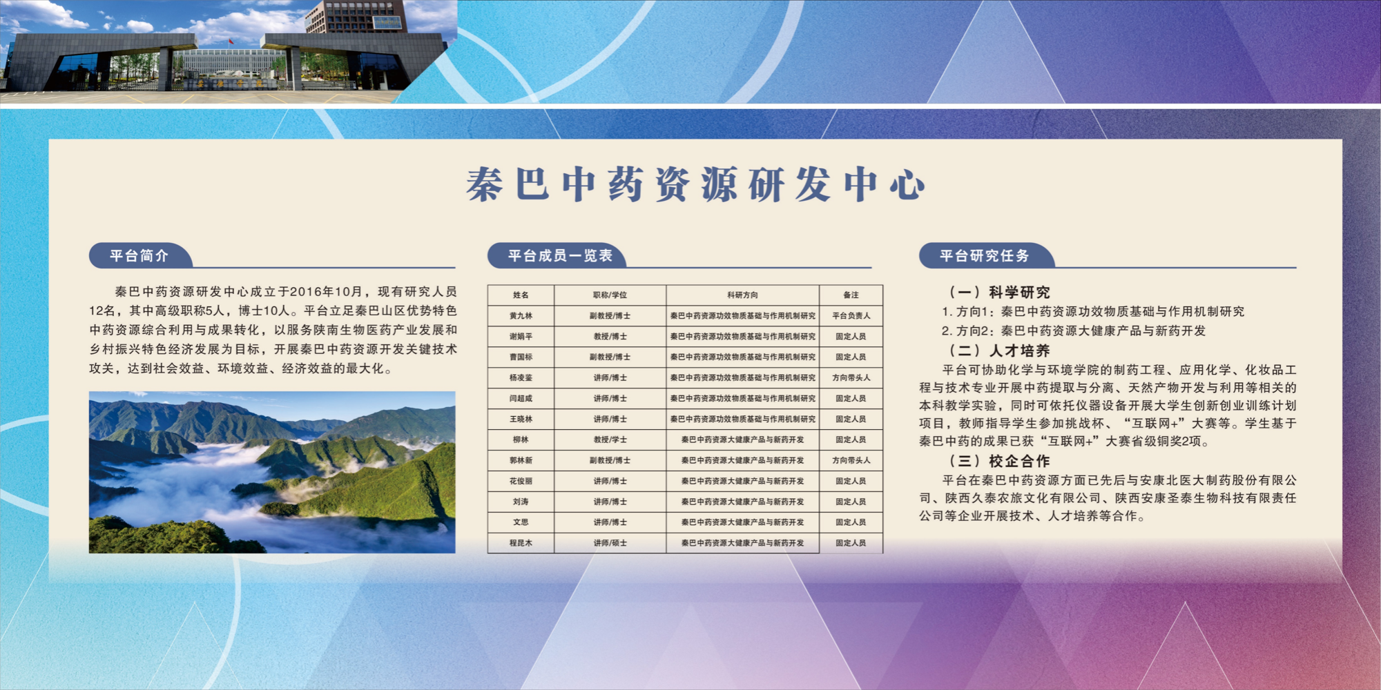 团队依托陕西省安康GAP工程技术研究中心、sunbet申搏sunbet实验中心和sunbet申搏秦巴中药资源研发中心,主要解决秦巴中药资源开发与利用过程中涉及到的关键技术和问题,为区域经济发展和制药产业人才培养做出了突出贡献。