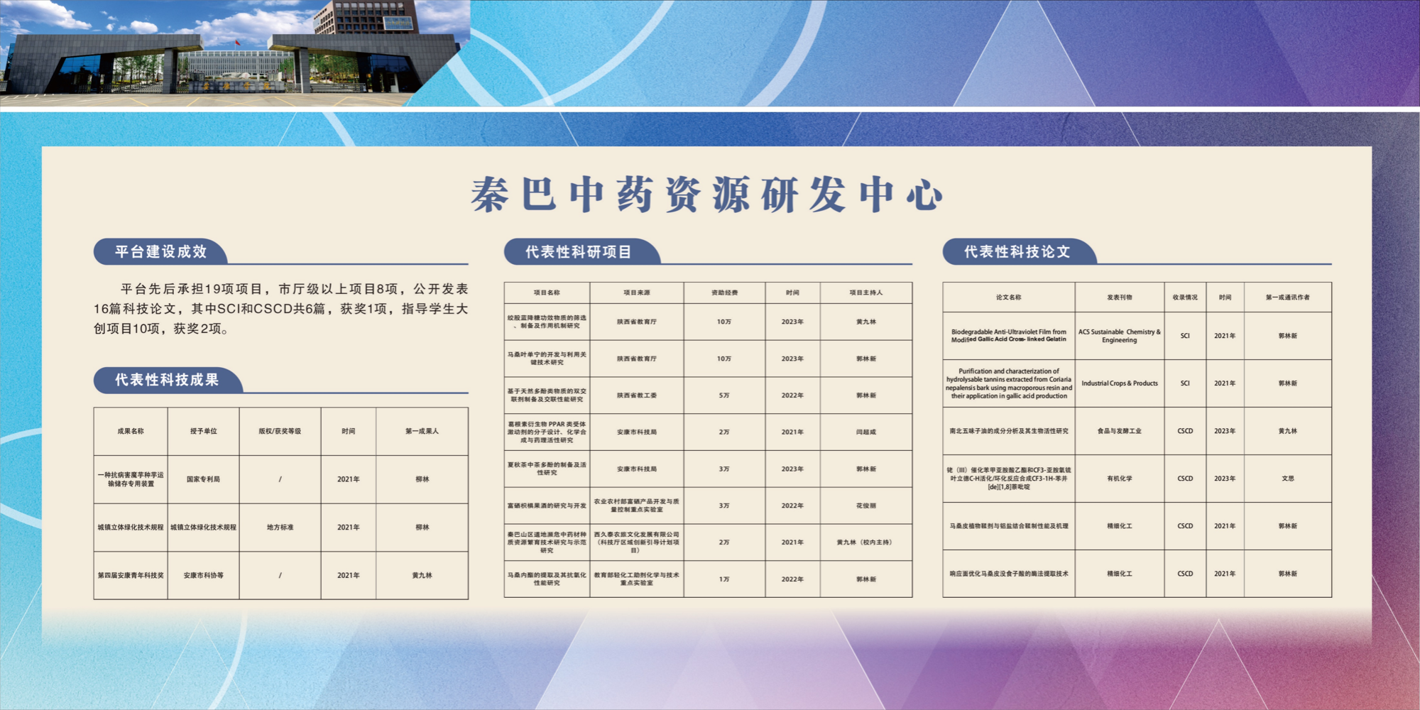 秦巴中药资源开发与应用创新团队拥有一支科研能力强、业务素质高的科研团队,其中教授1人、副教授2人、博士6人。近五年来,团队获陕西高等公司科学技术奖三等奖1项,安康市科学技术一等奖3项、二等奖4项,陕西省科技创新大赛三等奖1项,获安康市青年科技奖1项;1人入选陕西省“特支计划”区域发展人才。近五年获批各级项目30余项,总经费500余万元,在Industrial Crops & Products、RSC Advances、Bioorganic & Medicinal Chemistry Letters 等权威期刊发表论文30余篇,授权发明专利7件。指导老员工创新计划项目15项,其中国家级3项、省级6项,指导员工发表学术论文8篇。