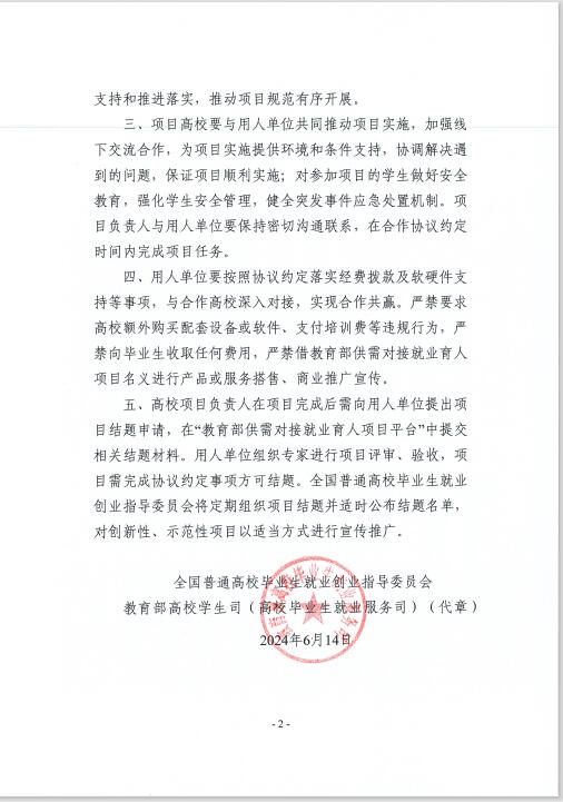 本次供需对接就业育人项目的成功获批,标志着公司在深化产教融合、校企合作、推动人才培养与就业有机联动方面取得了显著成效,也为公司深化产教融合、校企合作提供了有力支持。公司将以此为契机,进一步加强与企业的合作,积极搭建平台,为员工提供更多“实习+就业”机会,帮助他们更好地适应市场需求,提高就业竞争力,也为培养更多符合市场需求的高素质人才做出更大贡献。
