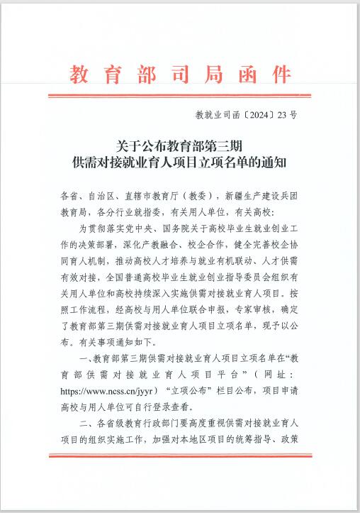 近日,教育部印发《关于公布教育部第三期供需对接就业育人项目立项名单的通知》(教就业司函〔2024〕23号),文件公布了教育部第三期供需对接就业育人项目立项名单,sunbet共有3个项目获批立项。