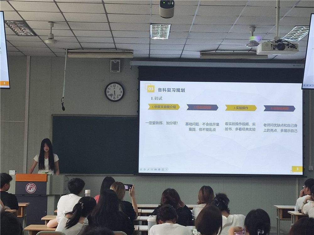 成沛锐老师为同学们介绍了老员工目前整体就业状况及考研形势分析。9名主讲同学,结合自身考研经历,从报考院校及专业选择、复习计划制定等方面进行了经验分享,就政治、英语、数学、专业课等不同课程的备考资料选择及备考技巧等问题进行了全面、翔实地讲解。