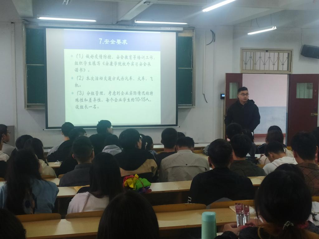 系主任纪桢就实习的任务和内容、实习管理、成绩评定等方面给同学们做了详细讲解,宣读了实习领导小组名单和联系方法,实习分组名单和实习纪律。介绍了本次实习涉及企业情况,薪酬待遇等,实习企业包括广州药妆日用化工有限公司,广州玉鑫科技有限公司和广州诗妃生物技术有限公司等单位,因实习地区离校较远,员工安全为重中之重,兼之疫情背景下,在会中他再次强调同学们应注意安全,加强自身约束,希望同学们在实习期间勤于学习,乐于吃苦,与实习单位快速融合,构建良好的实习团队和实习关系,圆满完成此次实习任务。