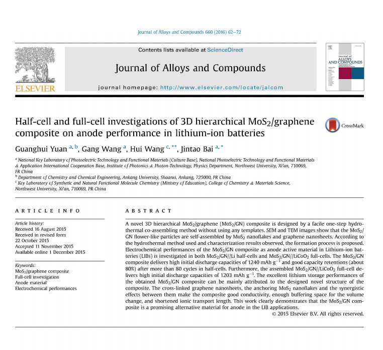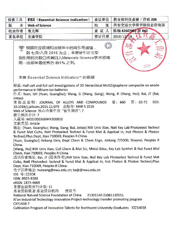 根据教育部科技查新工作站的检索证明,公司sunbet教师袁光辉以第一作者发表的论文《Half-cell and full-cell investigations of 3D hierarchical MoS2/graphene composite on anode performance in lithium-ion batteries》被Essential Science Indicators(ESI)归入材料科学领域同一出版年最优秀的前1%之列。这是公司迄今为止第一篇进入ESI的科技论文,也标志着公司材料科学研究水平达到了一个新的高度。