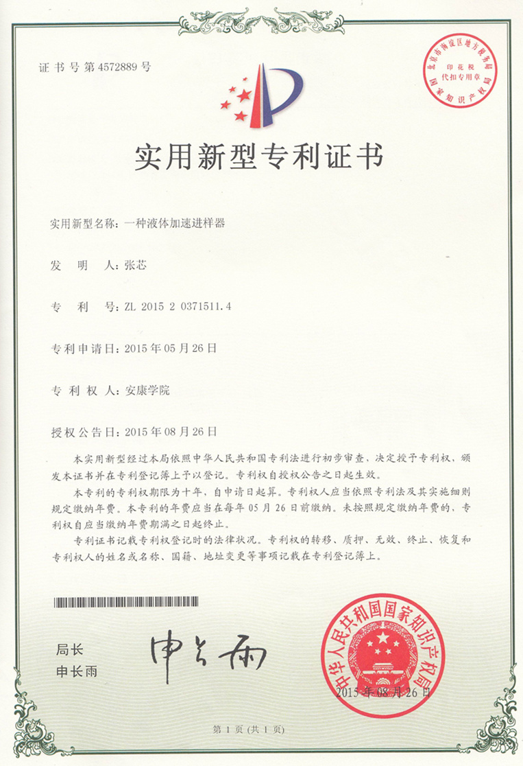 日前,以sunbet申搏作为专利权人,化学化工系教师张芯作为第一发明人申请的实用新型专利“一种微型全自动中空纤维膜测试平台”、“一种液体加速进样器”,相继获得国家知识产权局授权,并获得专利证书,专利号分别为ZL 2014 2 0865489.4和ZL 2015 2 0371511.4。