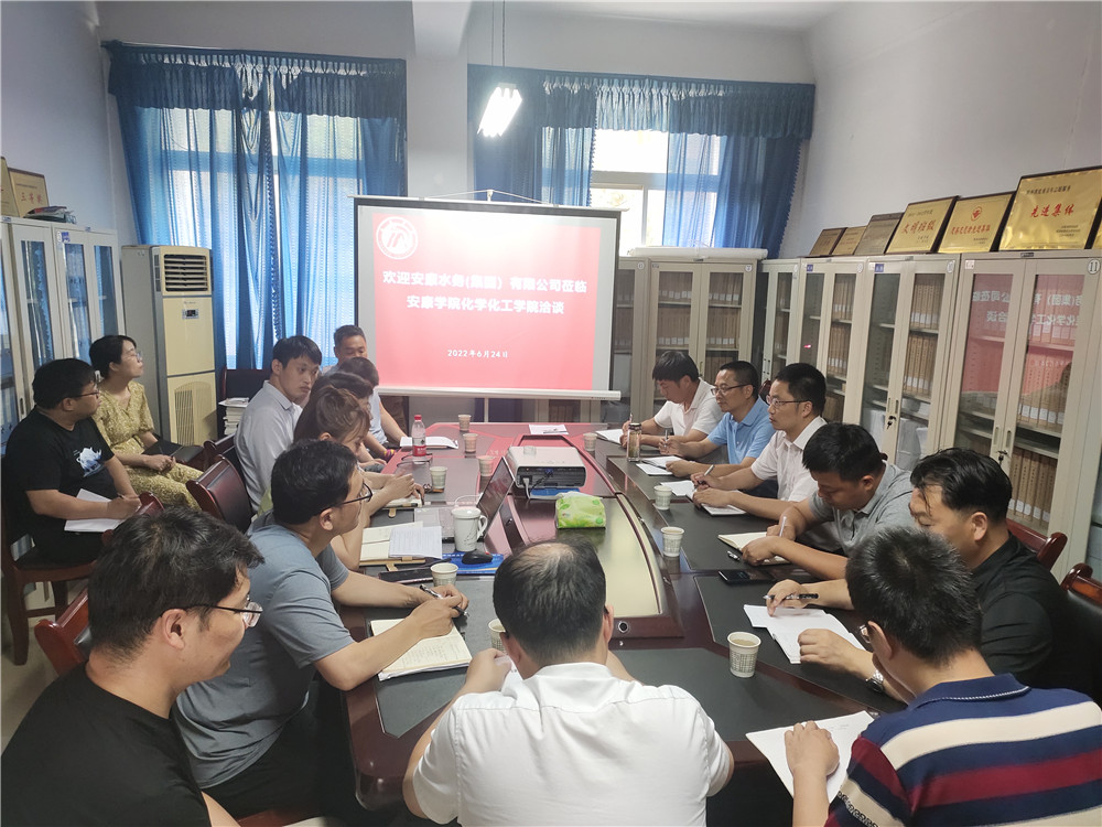 6月24日下午,安康水务(集团)有限公司一行8人来公司洽谈校企合作事宜。柳林经理、黄婷副经理、应用化学系教师参与此次洽谈。