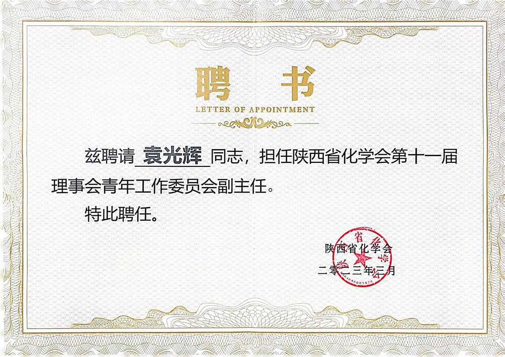 会议对理事会分支机构进行了换届,公司袁光辉教授当选为陕西省化学会第十一届理事会青年工作委员会副主任。