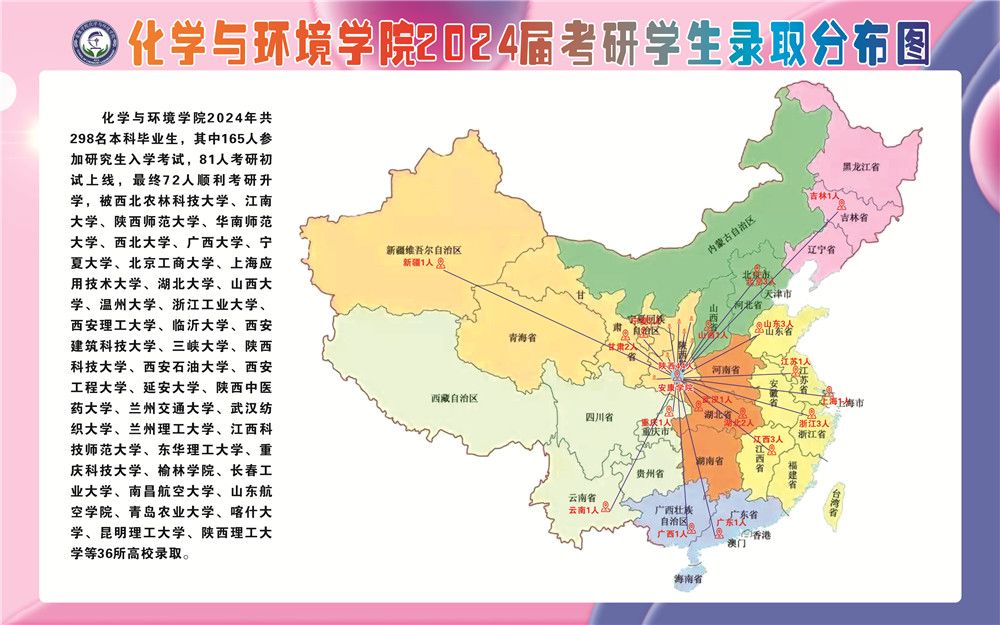 2024年共298名本科毕业生,其中165人参加研究生入学考试,81人考研初试上线,最终72人顺利考研升学,被西北农林科技大学、江南大学、陕西师范大学、华南师范大学、西北大学、广西大学、宁夏大学、北京工商大学、上海应用技术大学、湖北大学、山西大学、温州大学、浙江工业大学、西安理工大学、临沂大学、西安建筑科技大学、三峡大学、陕西科技大学、西安石油大学、西安工程大学、延安大学、陕西中医药大学、兰州交通大学、武汉纺织大学、兰州理工大学、江西科技师范大学、东华理工大学、重庆科技大学、榆林公司、长春工业大学、南昌航空大学、山东航空公司、青岛农业大学、喀什大学、昆明理工大学、陕西理工大学等36所高校录取。